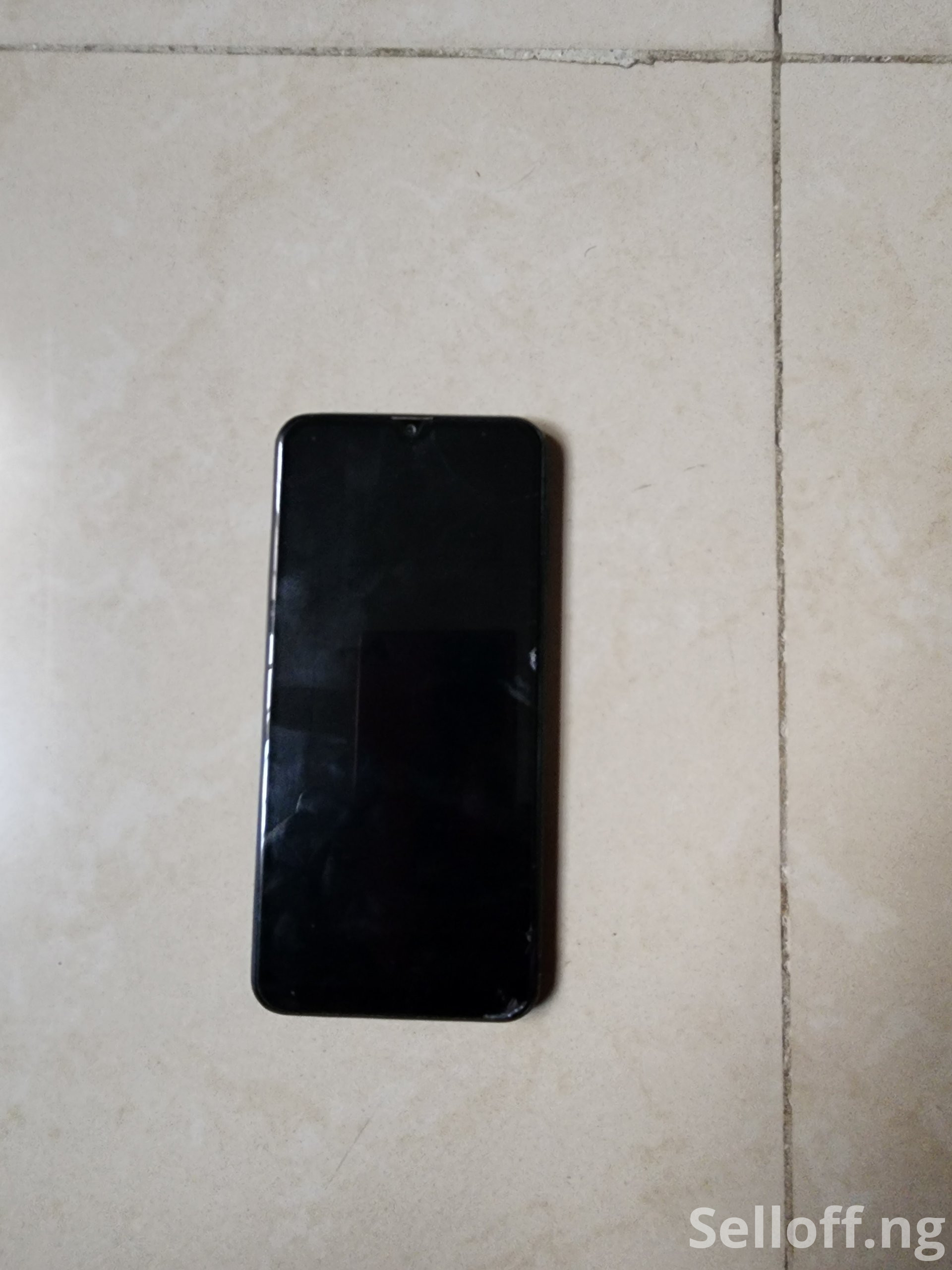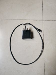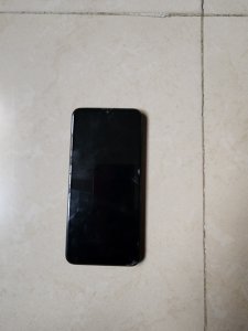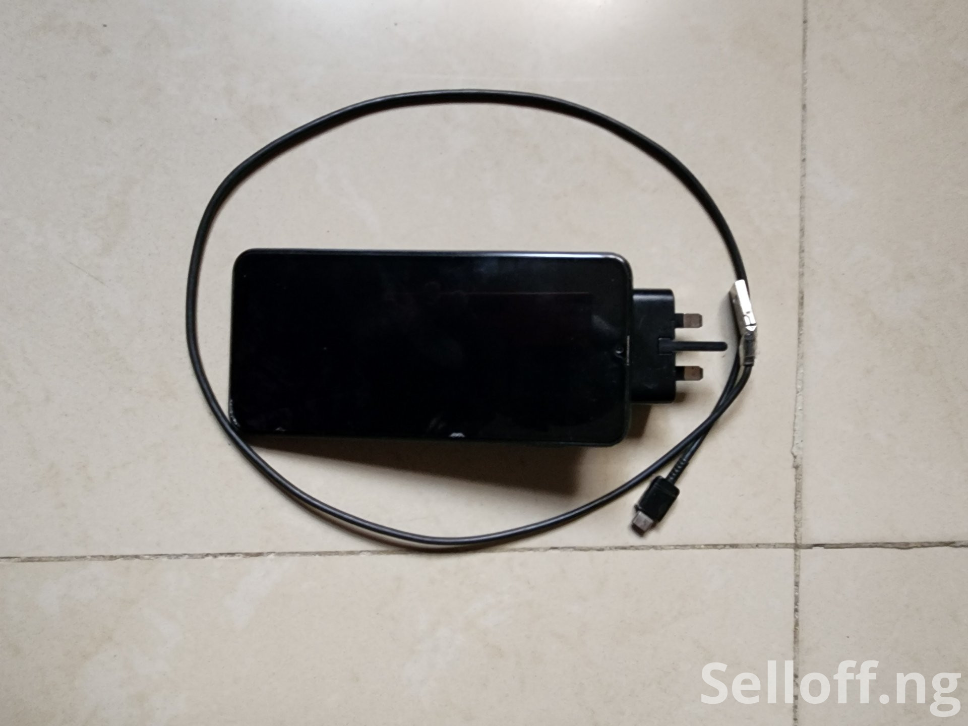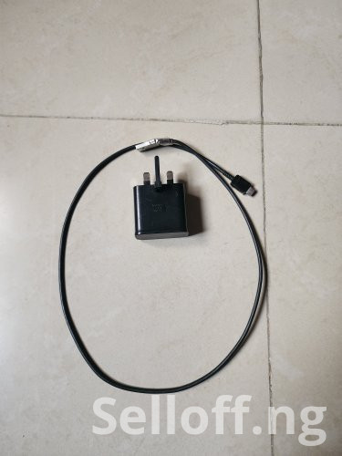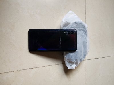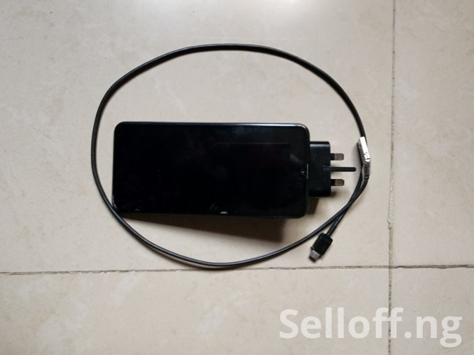 A black neat Samsung Galaxy A30s with functional charger and phone case.